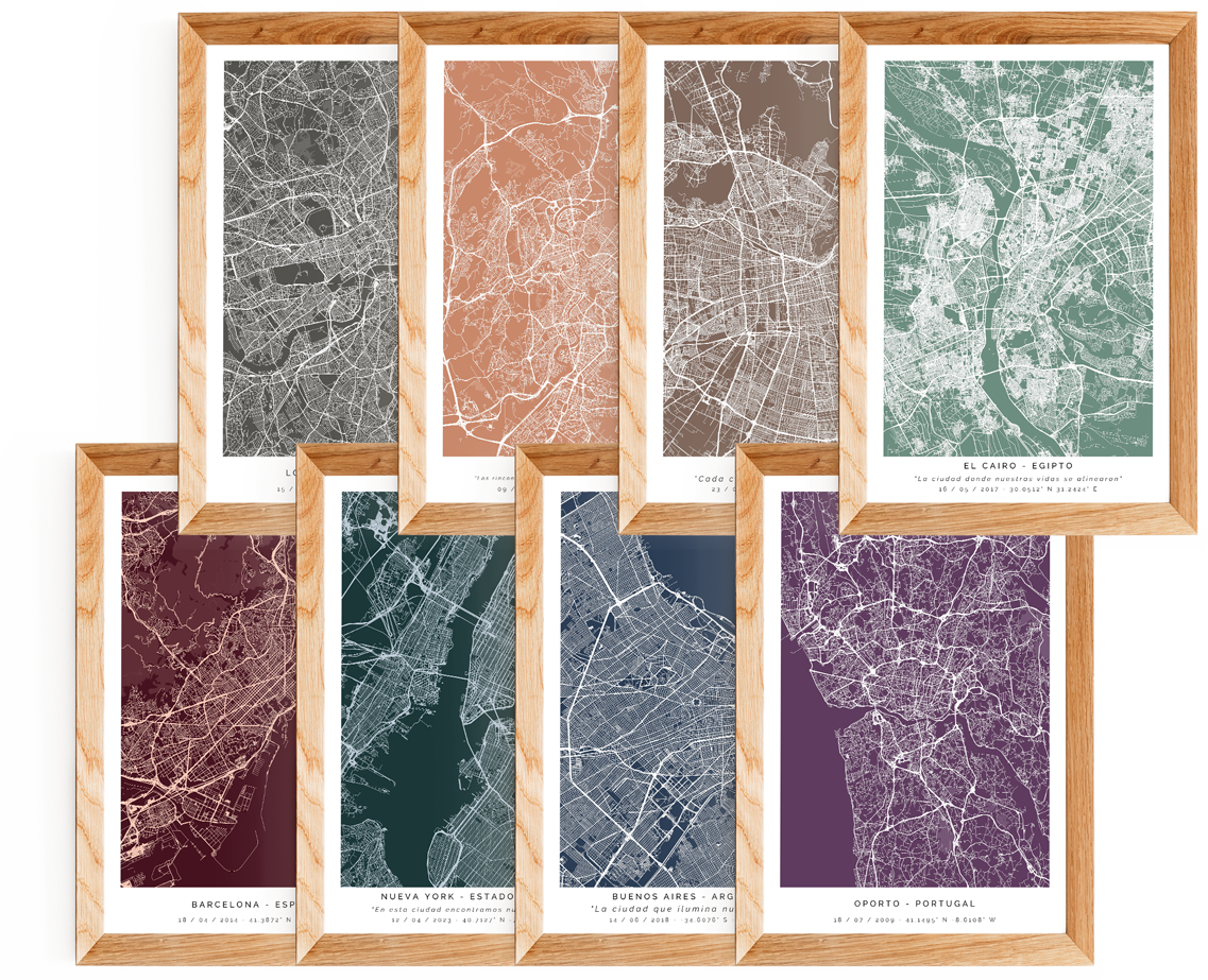 Los mapas de ciudad personalizados son ideales para bodas, aniversarios, cumpleaños y cualquier ocasión especial. Captura momentos únicos en un póster de ciudad o cuadro de ciudad que será recordado por siempre.