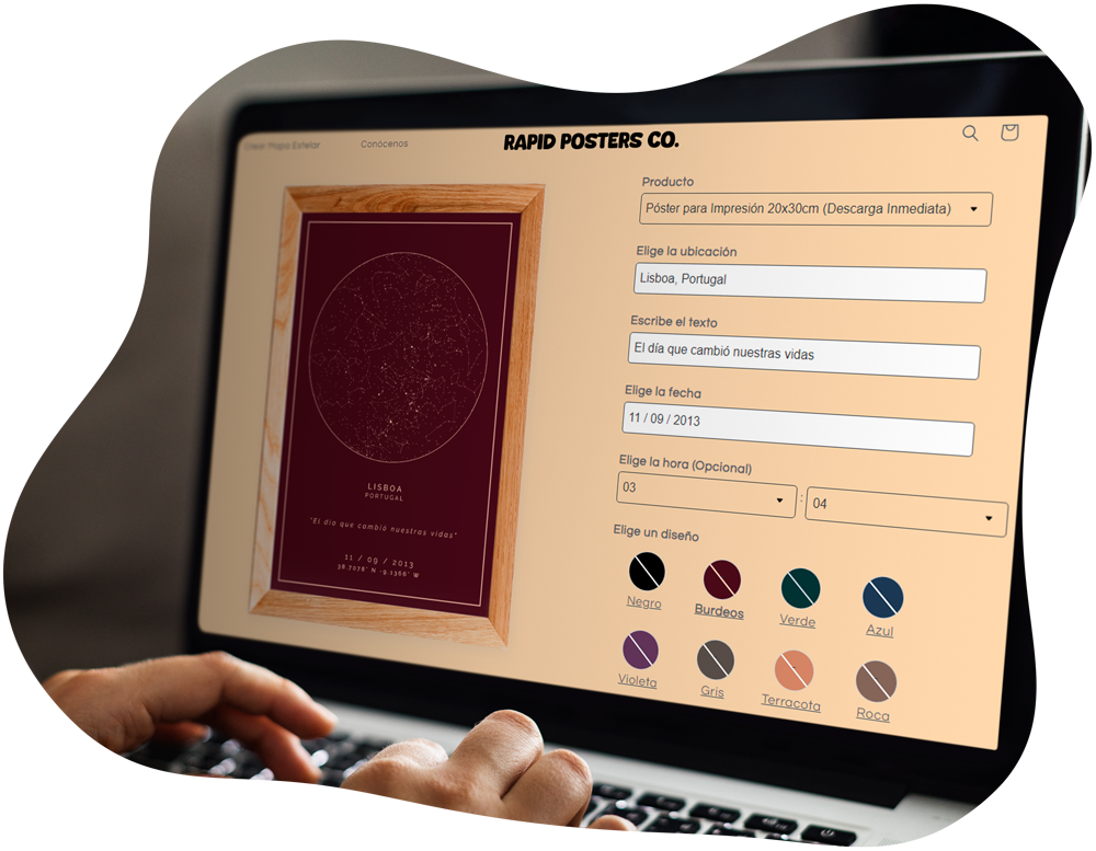 Rapid Posters Co. surgió del reto que propuse por ayudar al máximo número de personas a crear sus regalos personalizados de la forma más rápida, económica y sencilla posible.